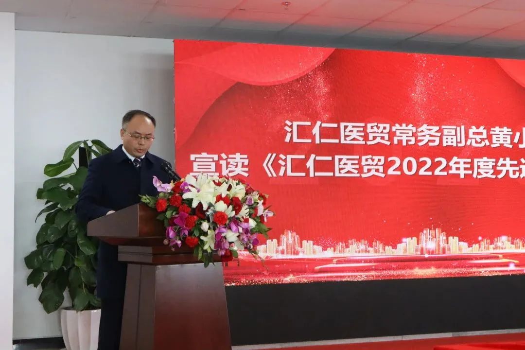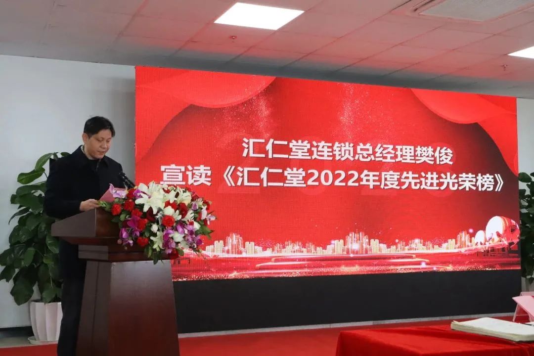 2022年,全體匯仁仁同舟共濟、毅勇向前,為公司高質(zhì)量發(fā)展加碼助力,在此期間,涌現(xiàn)出一批善謀實干、勇于擔當?shù)南冗M集體與個人。會上,匯仁堂連鎖總經(jīng)理樊俊宣讀了《匯仁堂連鎖2022年先進光榮榜》,匯仁醫(yī)貿(mào)常務副總經(jīng)理黃小峰宣讀了《匯仁醫(yī)貿(mào)2022年先進光榮榜》。