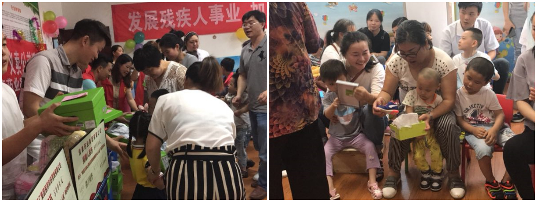捐贈儀式上,大家為52個康復孩子每人捐贈了一雙康復鞋子、水果、牛奶及點心等物品。孩子們知道大哥哥大姐姐的的到來,大家早早的開開心心、整整齊齊的坐好,也許一個坐姿對大家來講很簡單,但是對于這群孩子來說,卻是一件不那么容易辦到的事情。
